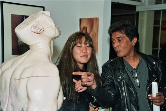 AMP Exhibiting Artist Ferril Nawir with a friend - and with Michael Laughlin's Zodiac sculpture. Photo by AMPer Martin J. Waterman.