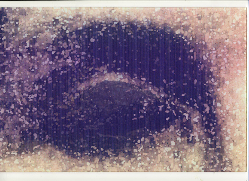 This is one view of a lenticular. The eye opens and closes as you pass by. This piece was part of a long dream sequence. I was interested in creating a stone or statuesque moving eye, with a quote to "winkies" as well. A performance artist has my other eye (yes, it is my eye.)