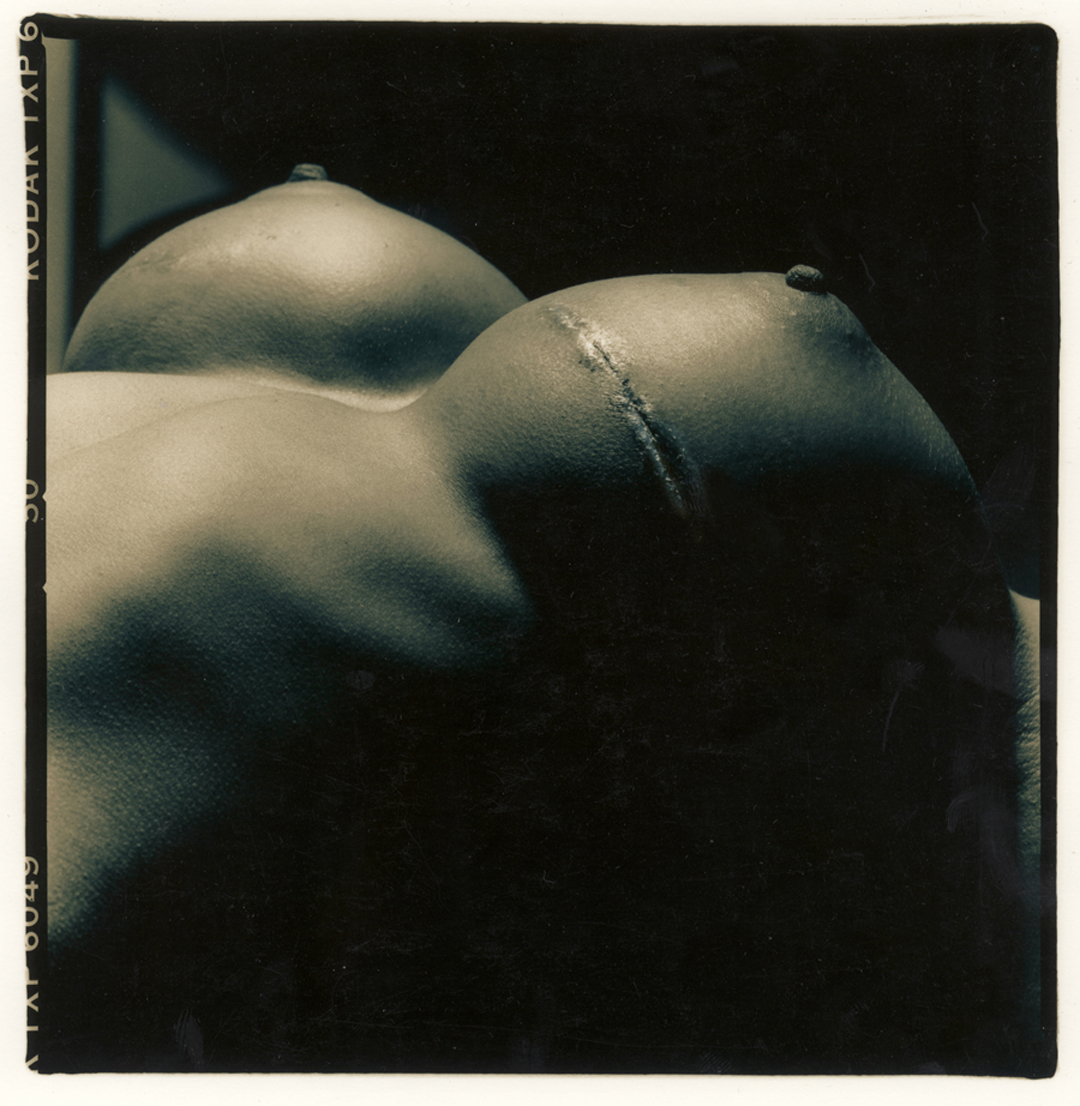 "New Breasts" was taken right after a young dancer had her stitches taken out from her second breast implant, it seems the first implant wasn't large enough. Rather than creating a new scar, the surgeon used the same incision and thus it moved further up her breast. This is a split tone print for the catalogue of nudes from my "Metal Plate" series.